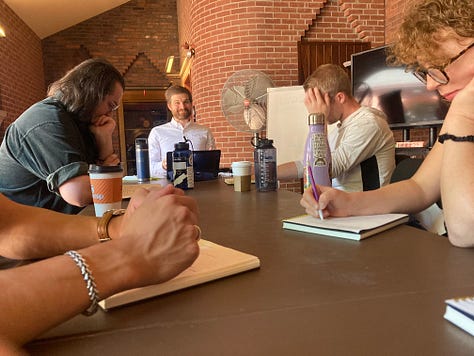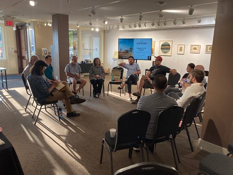It was a long evening…and a rich one. It started with a dozen of our Row House Members eating pizza in a circle with Justin and ended on the sidewalk outside The Trust with dwindling numbers of guests.